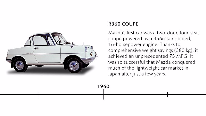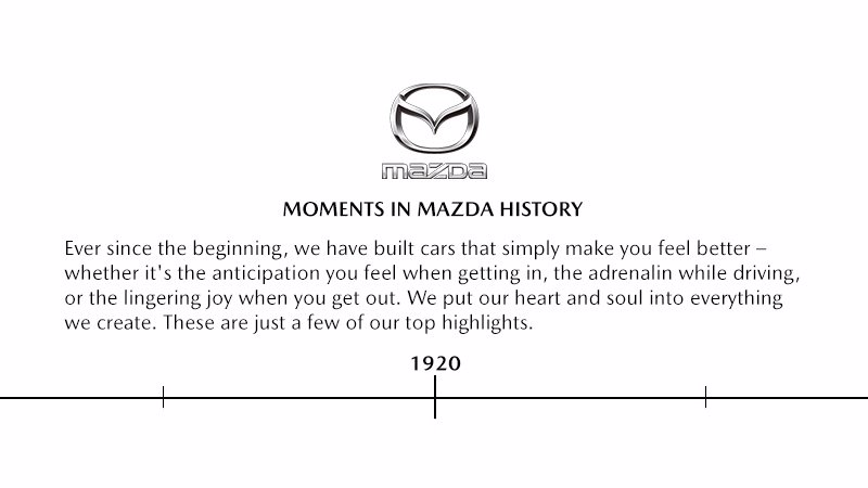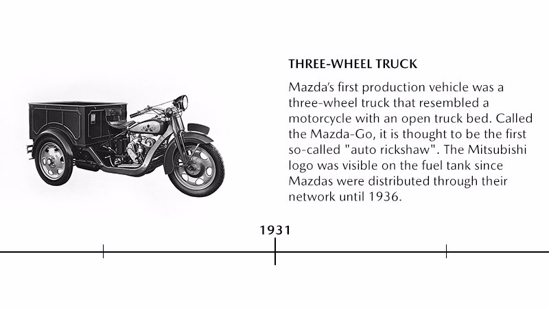 Meisterstücke wie der MX-5 Roadster, der Wankelmotor oder das Cosmo Coupé prägen heute den Ruf von Mazda als Autobauer. Doch begonnen hat das Unternehmen aus Hiroshima im Jahr 1920 in einer ganz anderen Branche, nämlich als Produzent von Kork-Waren. Bereits ein Jahr nach der Firmengründung, stellte der innovationsfreudige Firmenchef Jujiro Matsuda auf modernen Maschinenbau um. 1930 wurde schließlich der Prototyp eines motorisierten Lastendreirads präsentiert, der sich nur ein Jahr später unter dem Namen Mazda-Go zum ersten Bestseller des Unternehmens entwickelte. Mazda startete seine Pkw-Produktion im Jahr 1960 mit dem R360 Coupé. 1961 erwarb Mazda eine Lizenz zum Bau des Kreiskolbenmotors, erstmals eingebaut ab 1967 im futuristisch designten Cosmo Sport.