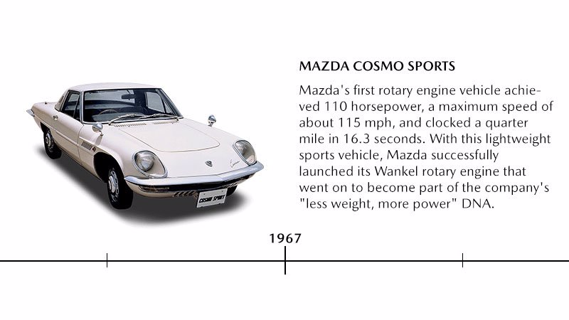 Einführung des Mazda Cosmo/110S, dem weltweit ersten Produktionsmodell mit einem Zweischeiben-Kreiskolben-Motor und das bis zu diesem Zeitpunkt zweite Wankelmotor-Produktionsmodell überhaupt. Mazda war als einziger Automobilhersteller in der Lage, Pkws mit Kreiskolben-Motoren erfolgreich zu vermarkten.
