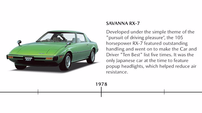 Ein stylisches, leichtes, sportliches Coupé mit dem Namen Mazda RX-7 wird in Japan auf den Markt gebracht. Bis 2002 verkaufte der Hersteller den Wagen über 800.000-mal weltweit und machte den RX-7 somit zum beliebtesten Auto mit Kreiskolben-Motor der Geschichte.