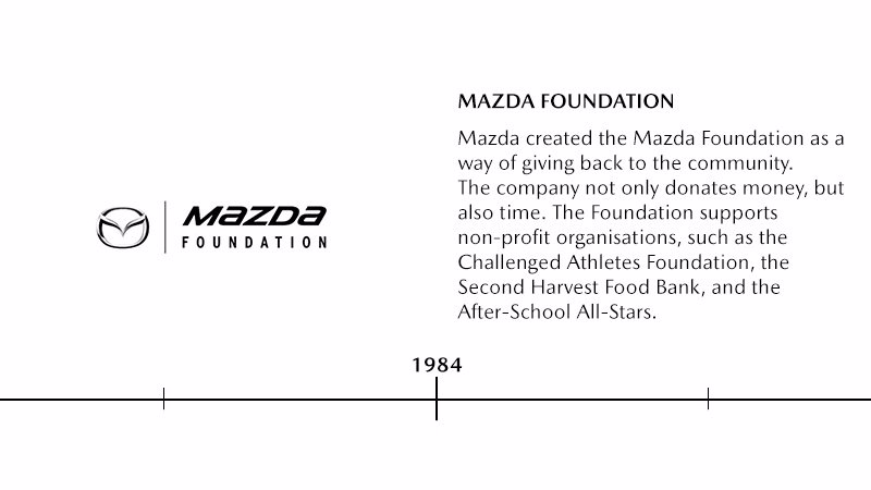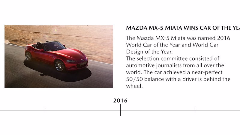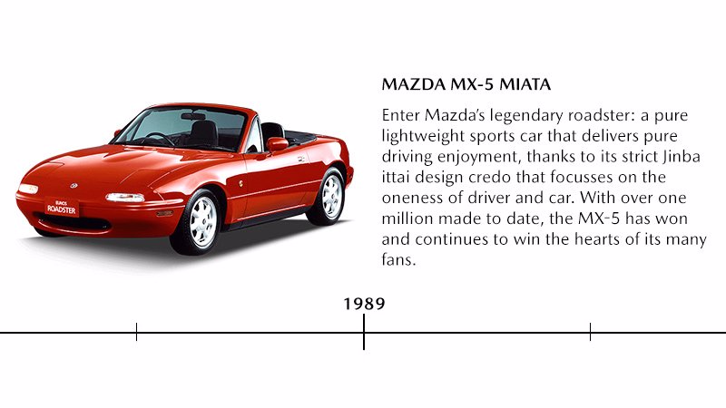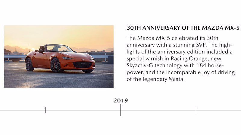 Einführung des Mazda MX-5, der den praktisch bedeutungslos gewordenen Markt für klassische Roadster wiederbelebt. Auf der Grundlage des sogenannten Jinba-Ittai-Konzepts (Fahrer und Fahrzeug in Einklang), setzt der Mazda MX-5 neue Maßstäbe für leichte Technologie und Fahrvergnügen.