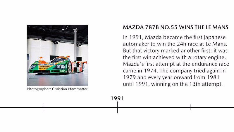 Als einer der größten Erfolge in der Geschichte der Wankelmotoren gewinnt der Mazda 787B zum ersten Mal seit Gründung des Rennens die 24 Stunden von Le Mans – der erste und bisher einzige Erfolg bei einem Langstreckenrennen mit einem Fahrzeug mit Wankelmotor.