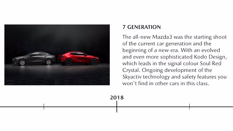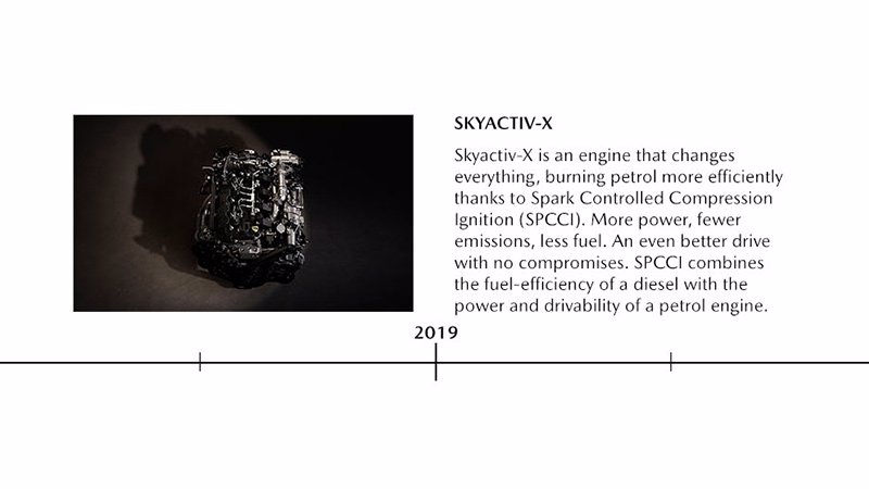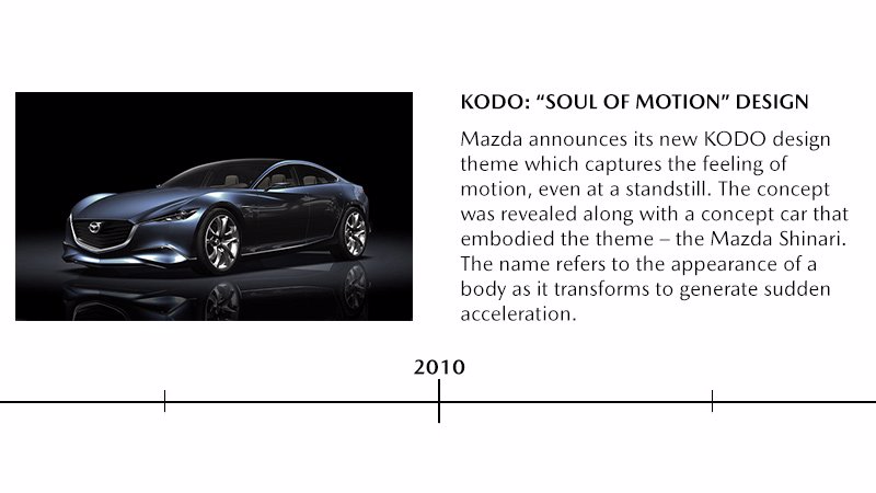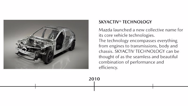 Einführung der Skyactiv-Technologie, einer unkonventionellen Reihe von Antrieben und Plattformen, die für maximale Effizienz, Leistung, Sicherheit und Fahrerlebnis ausgelegt sind, sowie der neuen Kodo-Designsprache von Mazda. Skyactiv und Kodo sind weiterhin die Grundlagen für die heutigen Mazda-Modelle.