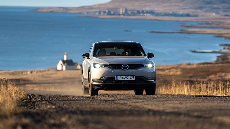 Der neue Mazda MX-30 e-Skyactiv R-EV (Energieverbrauch gewichtet, kombiniert, 1,0 l/100 km und 17,5 kWh/100 km, CO2-Emissionen 21 g/km, kombinierte Werte; Kraftstoffverbrauch bei entladener Batterie 7,6 l/100 km) im Land aus Feuer und Eis: Auf über 500 aufregenden Kilometern durch die atemberaubende, oft karge, gelegentlich stürmische und immer atemberaubende Landschaft Islands zeigt das neue Mazda Modell mit dem innovativen seriellen Plug-in-Hybridantrieb, wie Mazda das Streben nach Klimaneutralität mit dem markentypischen Fahrvergnügen verbindet.