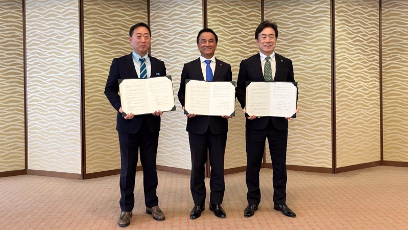 (V.l.n.r.): Bürgermeister Fukuda von Iwakuni City, Gouverneur Muraoka der Prefäktur Yamaguchi, Moro-san, CEO Mazda Motor Corporation mit der unterzeichneten Vereinbarung zum Bau einer Batteriemodulfabrik